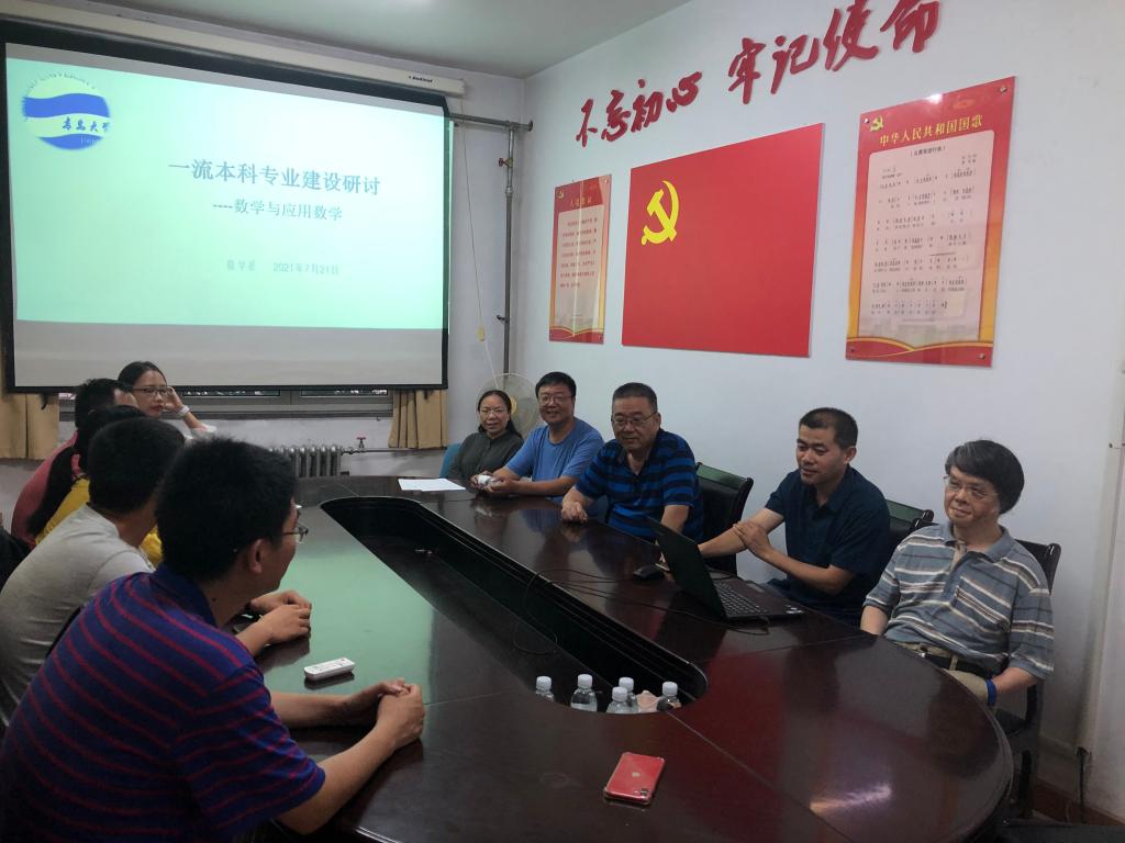 2021年7月21日9:00-11:00,tyc7111cc太阳成集团夏季学期第八场教师发展活动在励行楼218举行,数学系教师针对如何开展数学与应用数学一流本科专业建设进行了研讨,系主任刘开恩主持本次研讨。