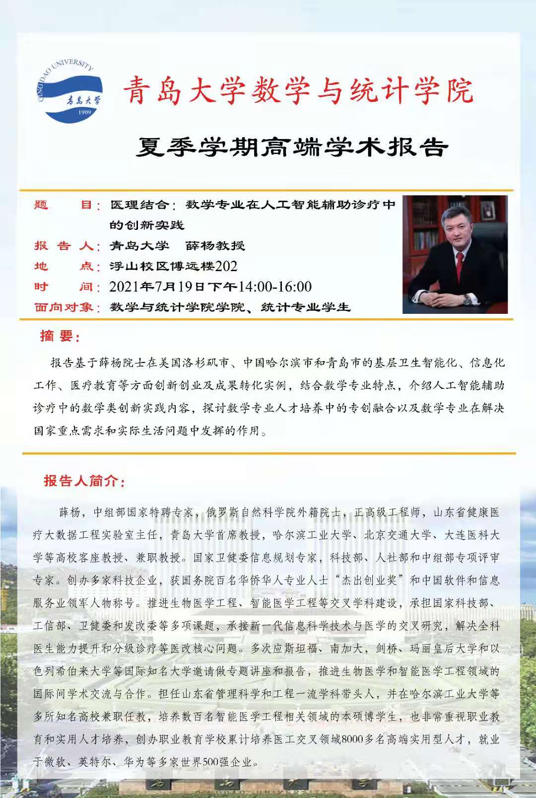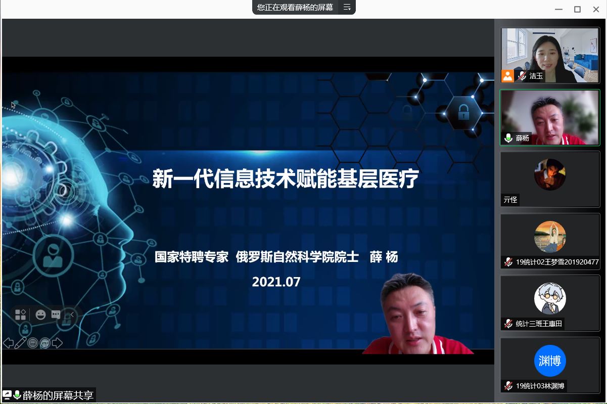 2021年7月19日14:00-16:00,tyc7111cc太阳成集团夏季学期第七场高端学术报告在腾讯会议线上举行,中组部国家特聘专家、俄罗斯自然科学院外籍院士、太阳成tyc7111cc健康医疗大数据研究中心主任薛杨教授作了“医理结合:数学专业在人工智能辅助诊疗中的创新实践”的创新创业类高端学术报告,tyc7111cc太阳成集团副院长丁洁玉主持报告。