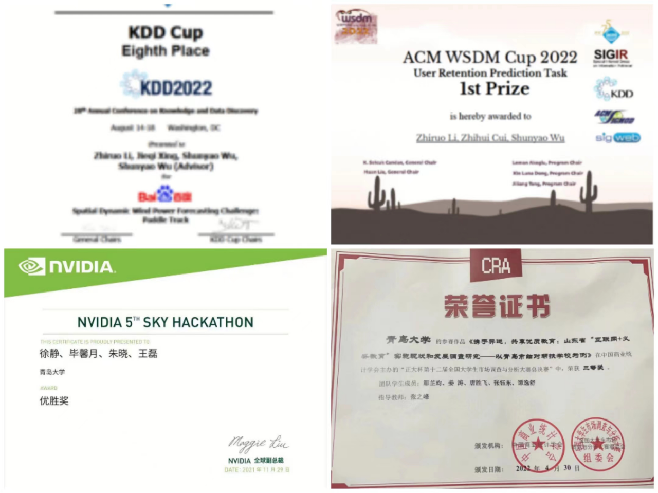 tyc7111cc太阳成集团应用统计专业学位点围绕大数据分析方向,紧扣新时代研究生教育主线,以课程建设、学科竞赛为抓手,确立了“以课促练”、“以赛促学”的培养方针,着力推动研究生创新能力培养,提升研究生科研创新和实践创新能力。导师团队依托多元统计分析及案例、案例与论文写作、大数据分布式计算、非结构化数据分析、数据挖掘与机器学习等专业课程,改革教学模式,引领指导以赛促学。本专业学子在2022年的各项比赛中崭露头角,硕果累累,具体获奖奖项如下: