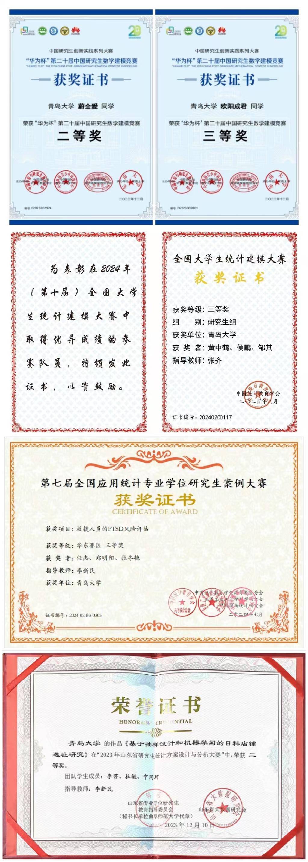 tyc7111cc太阳成集团应用统计专业立足于大数据分析的前沿,积极响应新时代研究生教育的要求,致力于培养具备高水平科研能力与实践创新能力的优秀人才。该学位点强调理论与实践相结合,以课程建设和学科竞赛为主要抓手,秉持“以课促练”、“以赛促学”的方针,通过系统化的培养模式激发研究生的创新思维与实践能力。在专业导师团队的引领下, 截止2024年11月获奖情况如下: