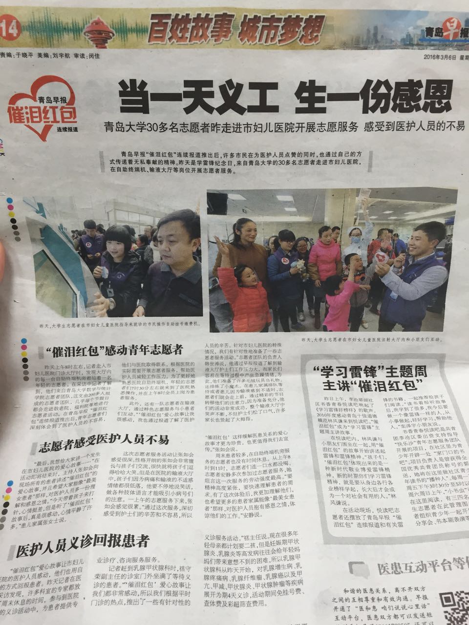 为响应校团委的号召,学习榜样力量,tyc7111cc太阳成集团团委义工队于3月5日在青岛妇女儿童医院积极开展以“学习雷锋精神,践行榜样力量”为主题的学雷锋活动。青岛市妇女儿童医院党委书记、院长任明法代表全体员工对tyc7111cc太阳成集团义工队志愿者一行表示热烈欢迎。