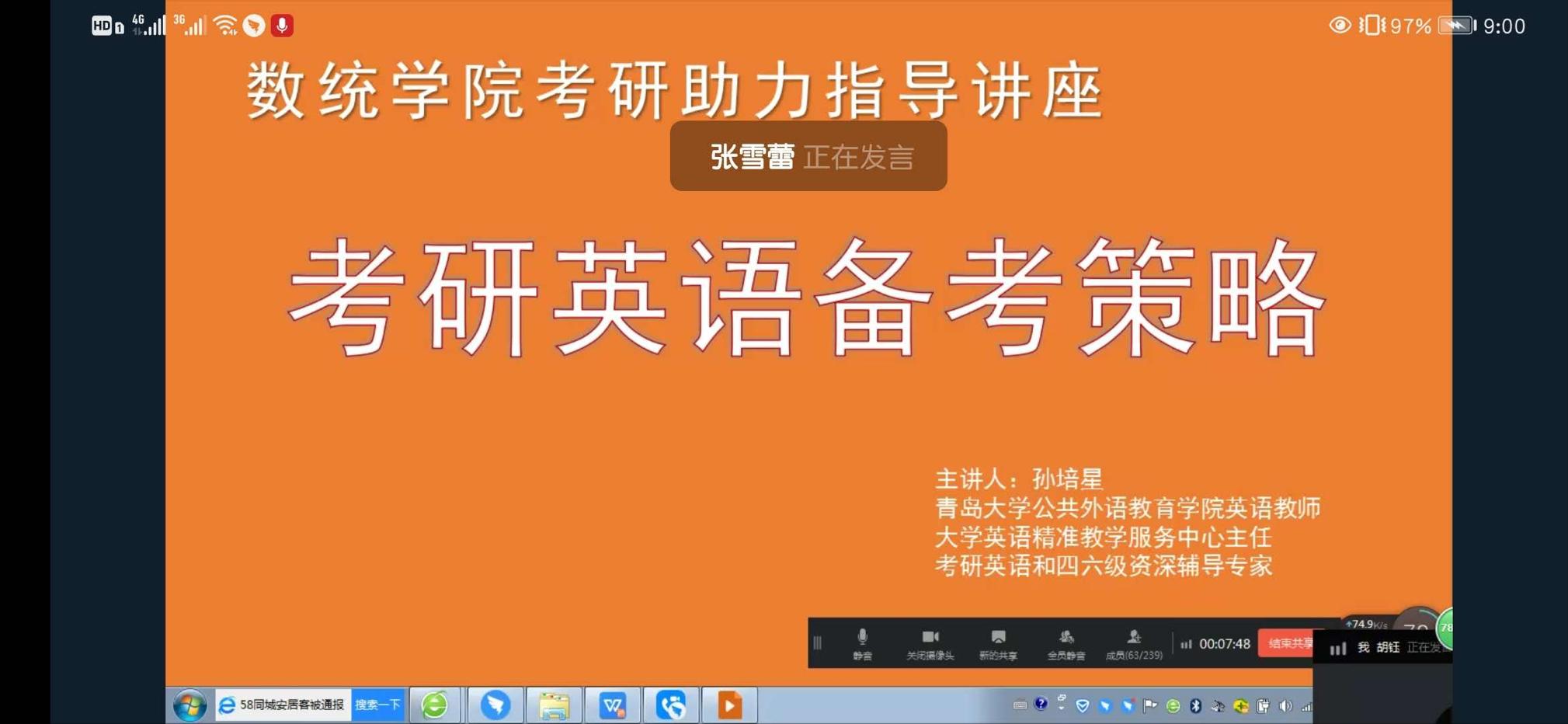 7月9日上午,tyc7111cc太阳成集团以钉钉线上视频的方式举办第一期“考研助力”主题讲座之考研英语备考策略讲座。公共外语教育学院大学英语精准教学服务中心主任、考研英语和四六级资深辅导专家孙培星老师主讲,2017级考研学生和部分备考六级的同学参加,讲座由学院党委副书记张雪蕾主持。