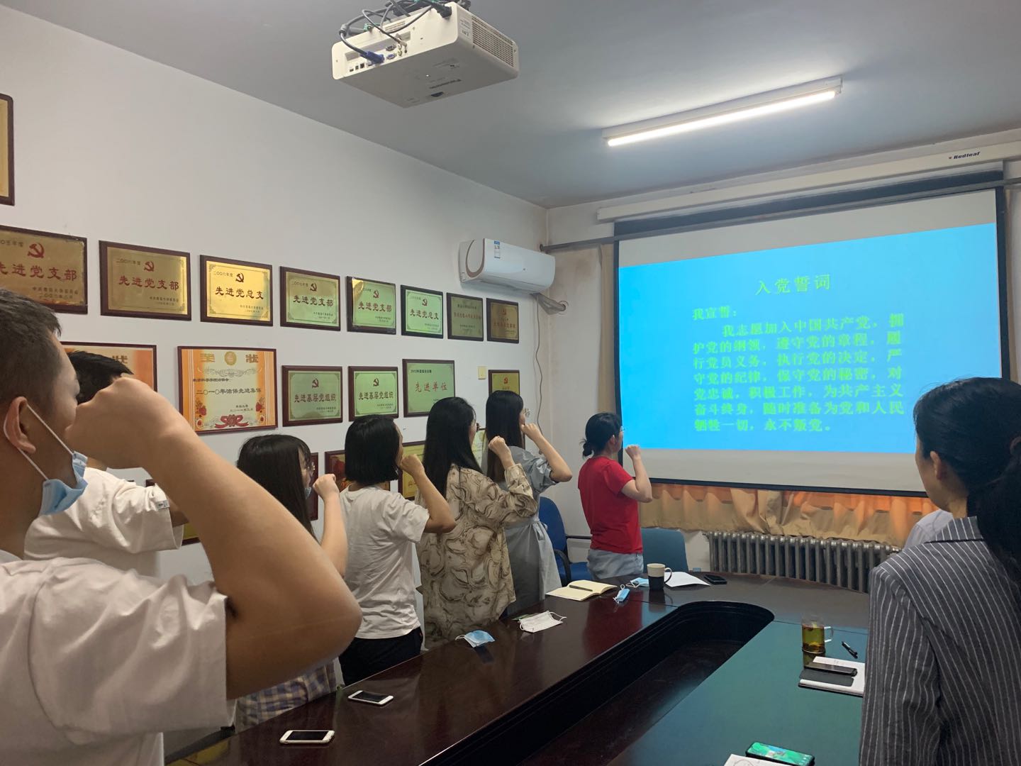会议第二项,毕业生党员带领全体党员重温入党誓词。大家精神饱满,高举右拳,重温入党誓词,铿锵有力的誓言响彻全场。