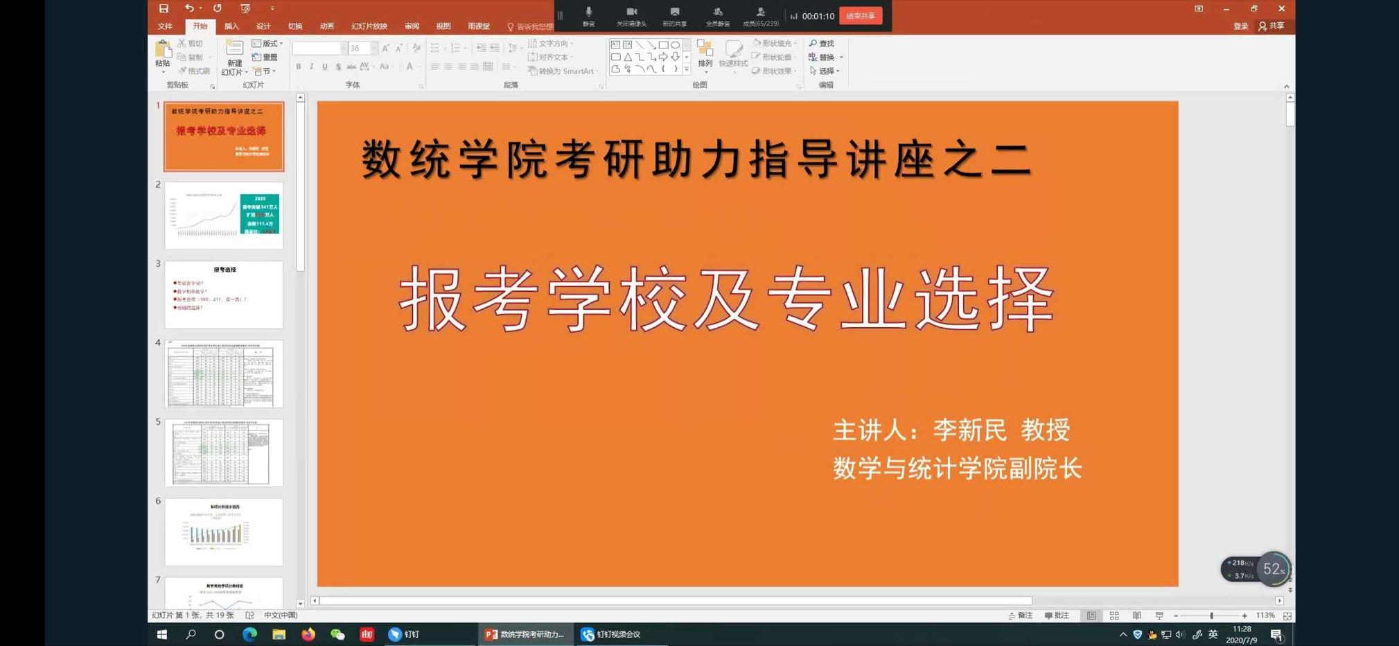 为帮助同学们备战2020年考研,7月9日,tyc7111cc太阳成集团通过钉钉线上直播的方式召开主题为“考研学校及专业选择”考研助力系列讲座。讲座由学院副院长李新民主讲,2017级考研同学参加。