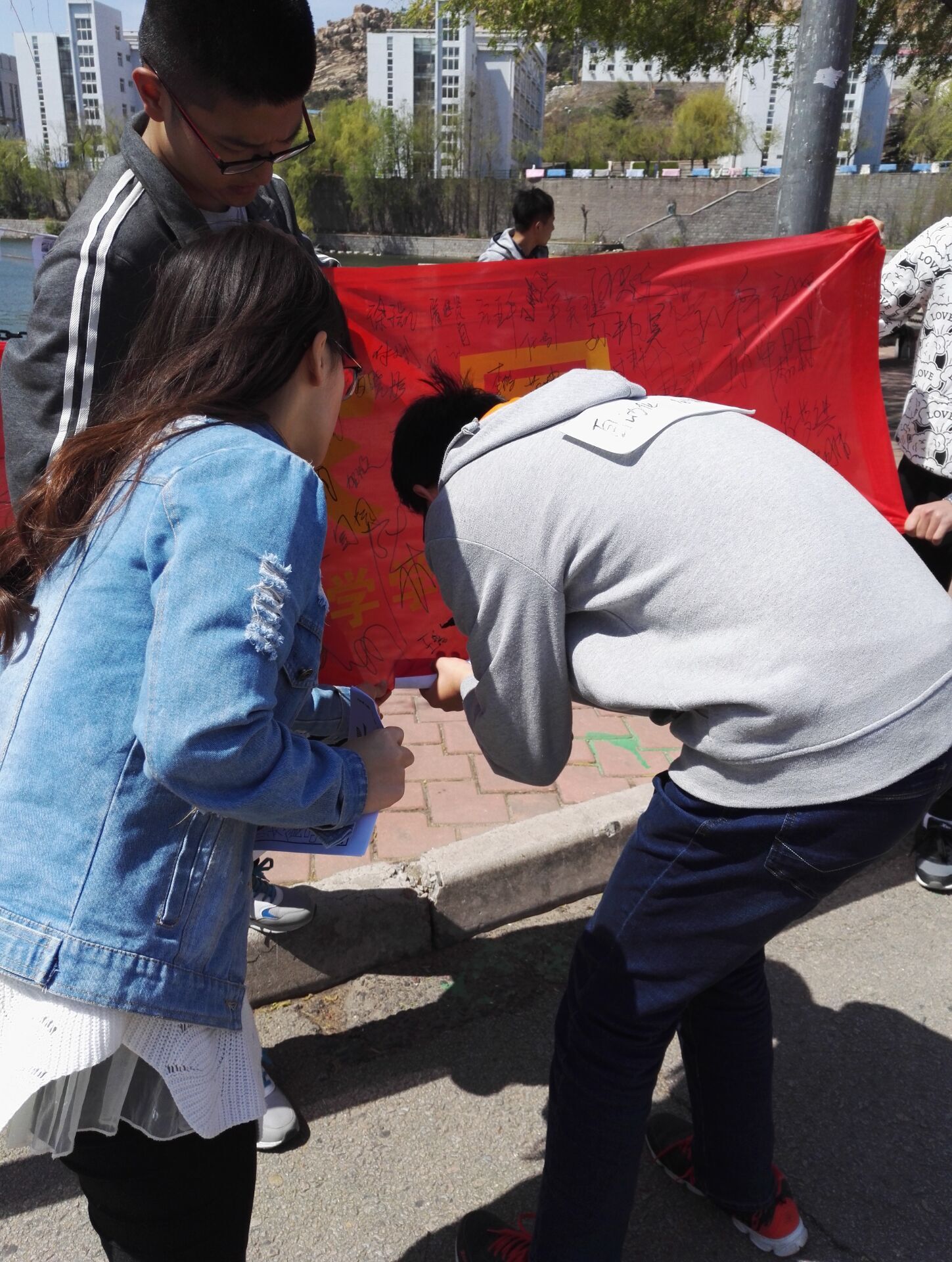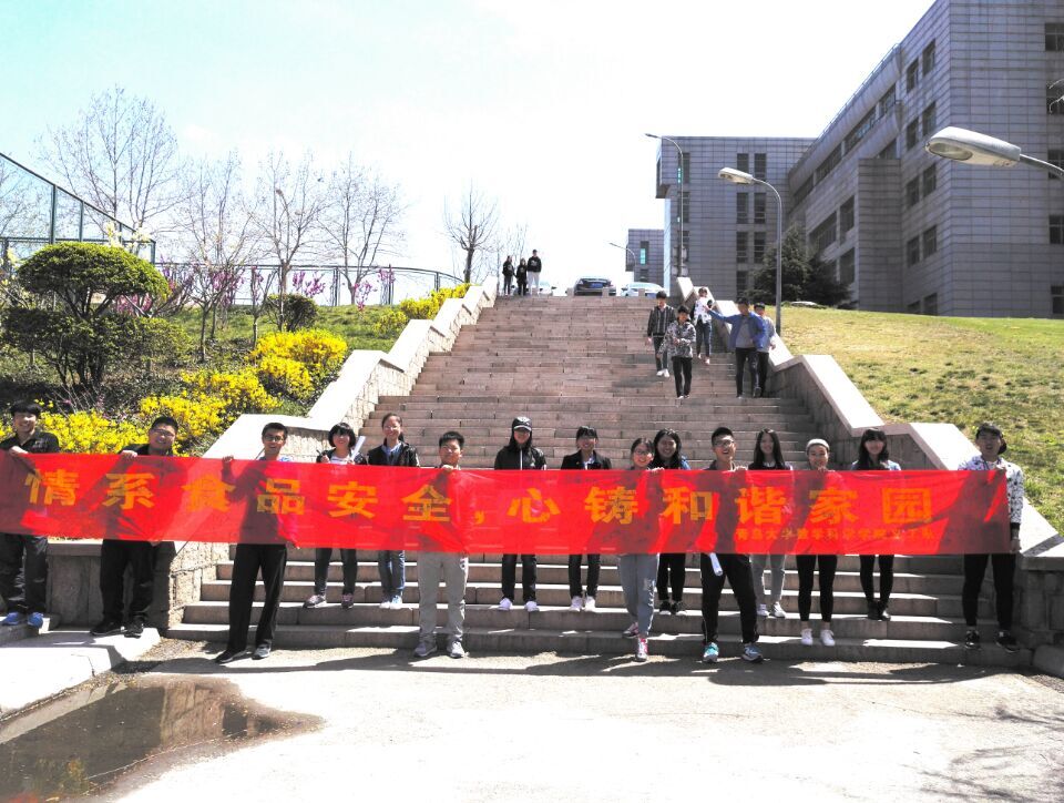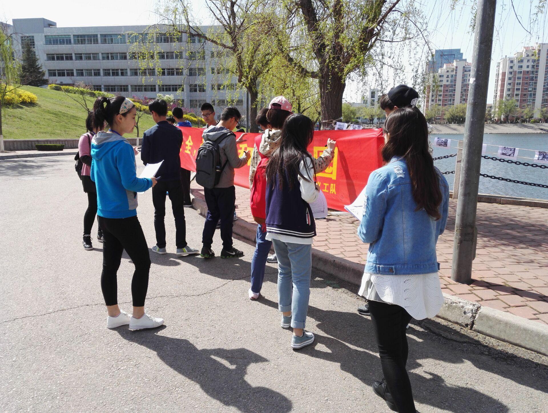 2016年4月17日,tyc7111cc太阳成集团义工队举办了以“情系食品安全,心铸和谐家园”为主题的签字活动。为了进一步让广大同学意识到食品安全对我们每一个人的重要性,达到真正的“吃得放心”,除了政府部门加强监督以外,我们每一个消费者都应该提高对食品安全的认识。 清晨八点半,tyc7111cc太阳成集团义工队队员们举着写着“情系食品安全,心铸和谐家园”的横幅站在剑湖边,在湖边拉起的绳子上挂满了食品安全主题的卡片,并做好了签名的准备工作。随着活动的进行,学生们、老师们以及热心群众都积极踊跃地投入到这次活动中。截至十一点,横幅上已经写满了名字,此次签名活动完美的落下了帷幕