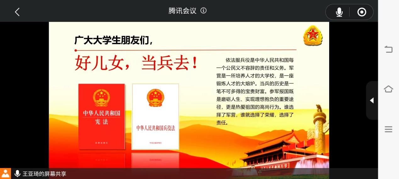 青春因磨砺而精彩,人生因奋斗而升华,为加强征兵政策宣传,进一步做好大学生参军入伍工作,1月9日20:00,我院举办大学生征兵政策线上宣讲会,由院学生会武装部部长王亚琦主讲,学院有意向参军入伍的学生参加本次会议。