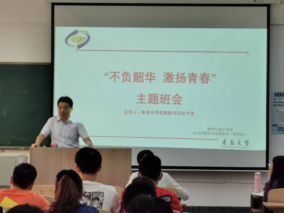 9月17日上午,校党委副书记杜方波深入tyc7111cc太阳成集团联系班级,在浮山校区博远楼205教室,参加了2019级数学与应用数学(师范类)班级“不负韶华,激扬青春”主题班会。班会由学院党委副书记张雪蕾主持,2019级辅导员朱雨彤及班级全体同学参加。